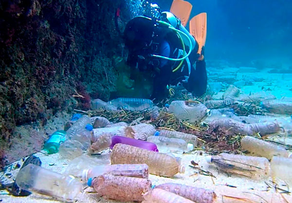 - На дне морей и океанов лежит очень много пластика. Если бы была возможность заглянуть вглубь, то мы увидели бы, что дно усеяно пластиковыми бутылками, пакетами, флаконами и другими упаковками. Как они туда попали? Часть с суши, а часть была выброшена с кораблей и другого транспорта. Загрязнения не только портят воду, но и несут опасность для морских животных, которые могут случайно проглотить отходы и погибнуть.