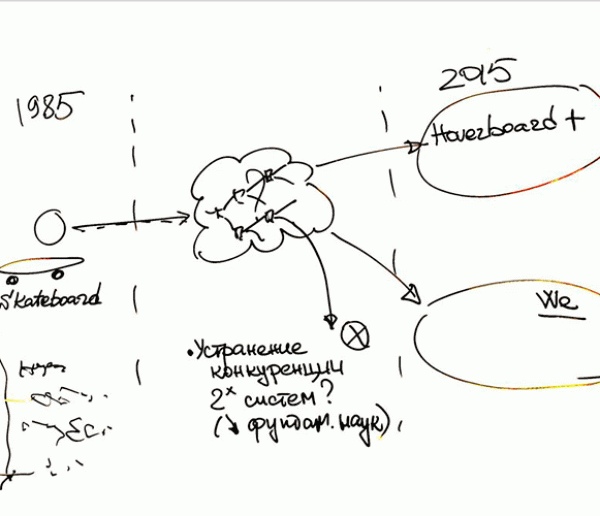 Как это выглядит на практике? Мы берем из далёкого будущего некий гипотетический, фантастический артефакт и переносим его в настоящее. Например, в фильме «Назад в будущее» это был летающий скейт, ховерборд. Кстати, тогда, в 1985 году, только-только появились скейтборды, и режиссёр Роберт Земекис явно играл с этим образом. Мы виртуально переносим эту штуку в настоящее, изучаем её и пытаемся понять, что происходило между настоящим и той точкой будущего, из которой эта штука перенесена. То есть мы моделируем будущее, предшествующее той точке, из которой взят предмет. Фактически мы реконструируем комплекс условий создания артефакта, точно так же, как в археологии, только ось времени разворачиваем в другую сторону. По сути, это такая специфическая технология мышления, и эта методика даже зарегистрирована в Российском авторском обществе.