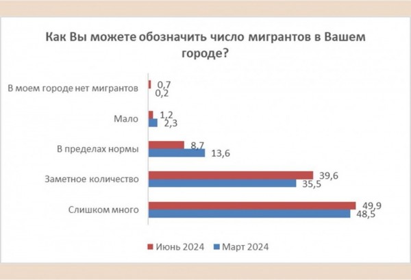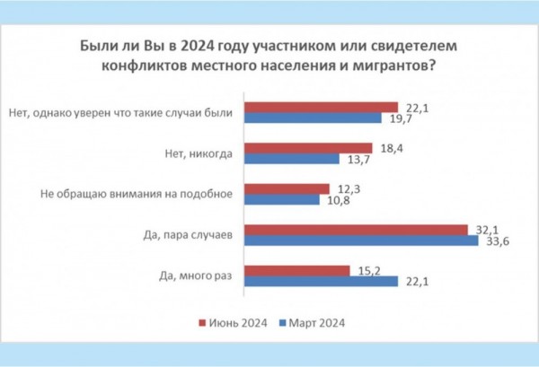 Были ли вы участником в текущем году, 2024-м, участником или свидетелем конфликтов мигрантов с местным населением? И здесь в целом что мы можем заметить опять же, в плюс нашей правоохранительной системе? В марте 22 ,1% говорили о том, что много раз были свидетелями конфликтов местного населения и мигрантов, кто-то даже был участником подобного конфликта. В июне этот показатель существенно сократился. Поэтому нельзя отрицать очевидное: действительно ситуация с миграционной проблемой после трагических событий в «Крокус Сити Холле» в значительной степени была взята под контроль, но в восприятии этой ситуации все равно продолжается движение в негативном направлении, и сама по себе эта проблематика воспринимается очень остро.