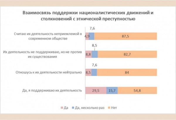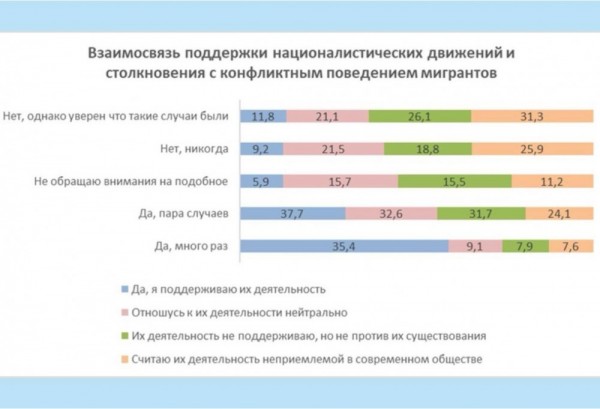 И последнее сравнение. Среди тех, кто становился объектом противоправных действий мигрантов, именно уже противоправных, не просто конфликтных, наиболее высокий уровень поддержки националистических движений мы имеем. То есть, если у человека была уже какая-то ситуация, прямо связанная с противостоянием с мигрантами, то он это будет помнить, скорее всего, всю оставшуюся жизнь и это негативный осадок будет отражаться и на уровне его политических взглядов.