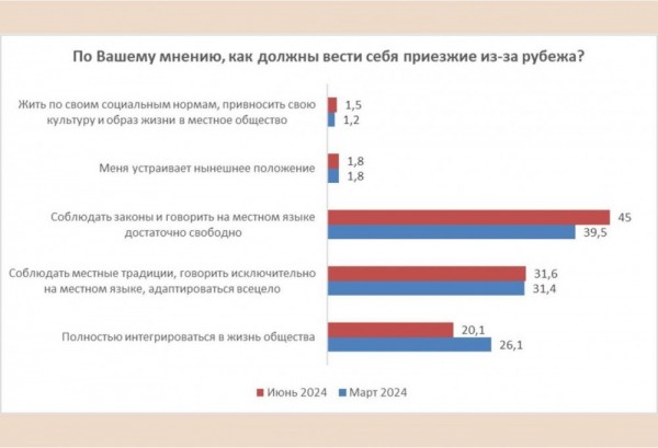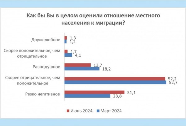 Вопрос: «Как бы вы в целом оценили отношение местного населения к миграции?» Здесь тоже интересный момент, резкий рост достаточно заметный, существенный. Мы наблюдаем по пункту резко негативное отношение. То есть, объективно за несколько месяцев под влиянием каких-то обстоятельств отношение населения к мигрантам стало значительно хуже. Если мы сравним март и июнь, то увидим заметное различие.