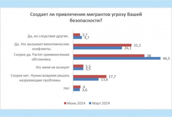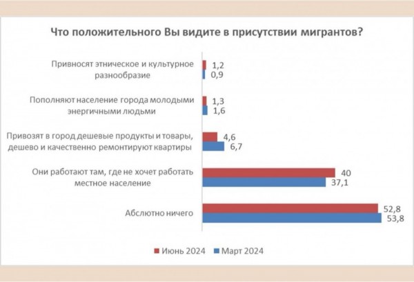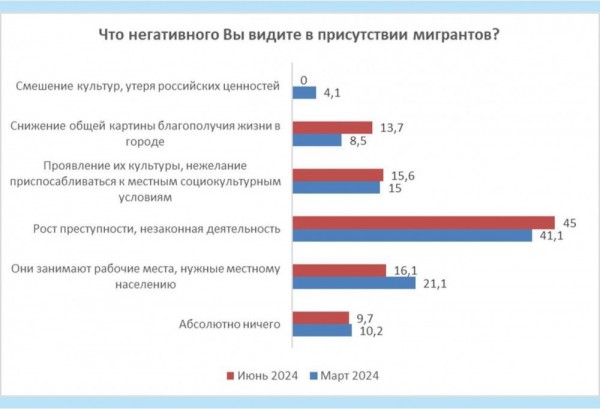 А что негативного люди видят в присутствии мигрантов? В первую очередь, рост преступности, незаконная деятельность. При этом если сравнивать март и июнь, то опять же увеличивается на достаточно высокое количество процентных пунктов группа людей, которые полагают, что от мигрантов происходит потенциальная угроза, опасность. Такие опять же умозрительные вещи как смешение культур и так далее опять же мало кого волнуют. Волнует чисто прикладной момент: «от мигрантов исходит угроза моей жизни, имуществу, безопасности и так далее». Все очень рационально.