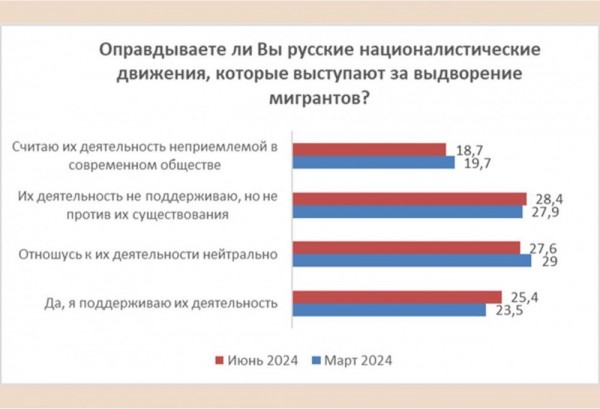 Вопрос: «Оправдываете ли вы русские националистические движения, которые выступают за выдворение мигрантов?» Имеются в виду те самые радикалы, которых якобы там кто-то видит на улицах в растущем количестве. В июне немного, по сравнению с мартом, выросла поддержка этих движений, но пока это не критично, хотя все равно цифры достаточно большие.