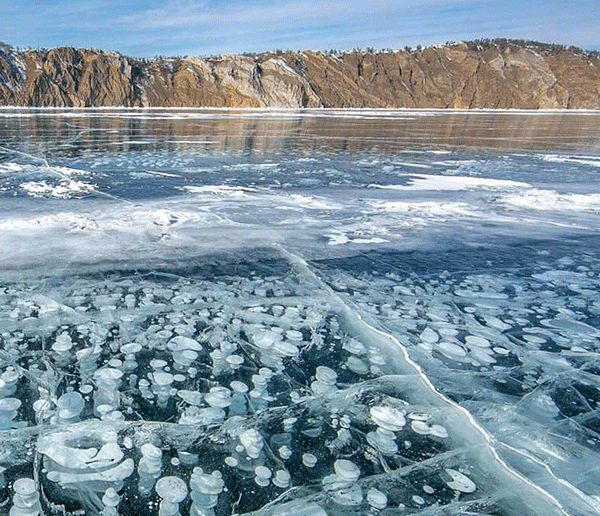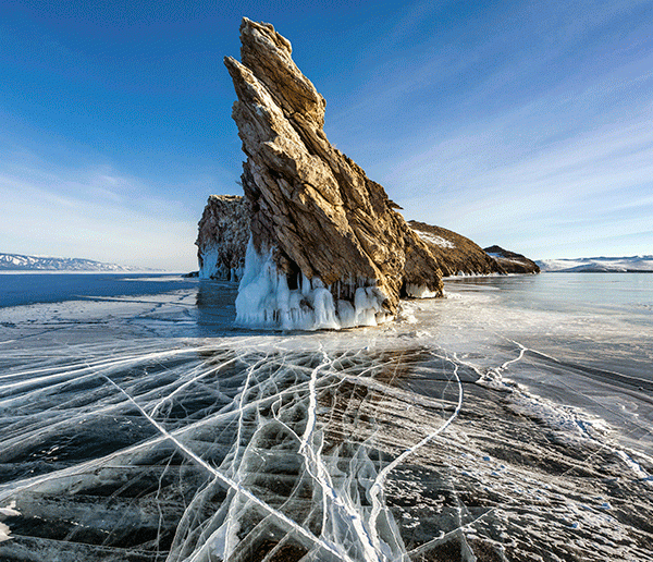 Ледовых достопримечательностей на Байкале масса. В разных частях озера, особенно на западном берегу, лед выглядит по-разному. Это зависит, прежде всего, от ветра, потому что такой прозрачный ровный, совершенный лед возникает благодаря особой розе ветров, которая только на Байкале присутствует. Внешний облик льда очень разнообразен - это трещины, торосы, гигантские глыбы льда, есть еще и наплески, и ледяные гроты. Больше всего разных ледяных чудес в районе знаменитого острова Ольхон, который находится рядом с Малым морем, проливом между западным берегом и островом Ольхон. Это место – главный центр притяжения для зимних поездок, потому что там самый прозрачный, самый гладкий лед.