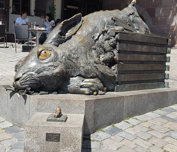 Конечно, в Нюрнберге обязательно надо увидеть дом Дюрера. Это такая большая достопримечательность, поскольку сам Дюрер для нас очень знаковый человек: как Пушкин в России «наше все», так у нас Дюрер «наше все». Возле дома Дюрера лежит скульптурный заяц, который всегда привлекает внимание. Люди часто его в интернете уже видели, поэтому просят отвести их к зайцу. Это такой заяц-монстр – отсылка к «Зайцу» Дюрера, его знаменитой картинке-акварельке с зайчиком. Но тут не милый зайчик, а некое хтоническое чудовище. О его символическом значении стоит рассказать отдельно.
