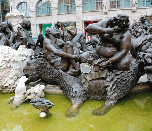 Полина Дотц: Это правда очень интересная статуя 1984 года, её создал местный скульптор Юрген Герц. Его, конечно, много раз спрашивали: «Что ты хотел сказать своим творением?» А он не отвечает, держит интригу, и очень правильно делает, я считаю. Герц говорит: «Что хотел сказать этой статуей, я уже сказал, а вы сами думайте». Поэтому есть разные версии, что эта статуя обозначает. Самых популярных, пожалуй, три.