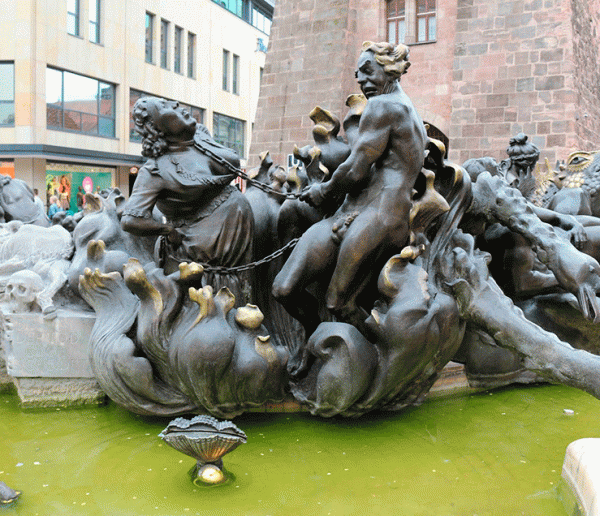 Потом у нас есть очень красивая открыточная композиция, которая называется «Мост палача». Там не просто мост, а целый комплекс зданий. Если идти еще дальше, можно увидеть «Карусель брака», очень забавный фонтан, он современный, но это отсылка к старому стихотворению. Был такой поэт Ганс Сакс, которого изучают в школах до сих пор, у него есть стихотворение «Горько-сладкая семейная жизнь». В этом стихотворении он описал, что в семейной жизни бывает хорошо, бывает плохо, бывает мы ссоримся, бывает миримся, но все равно жена - мой лучший друг. Скульптор, которому заказали этот фонтан, разводился на тот момент, и настроение у человека было не очень хорошее, поэтому он изобразил брак своеобразно.