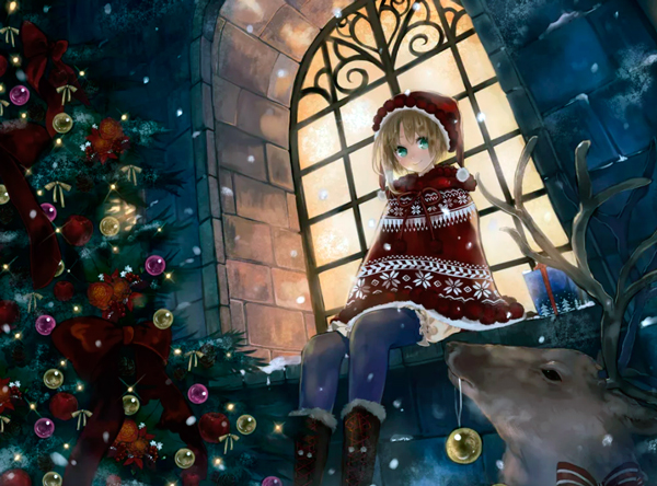 Картинка аниме 1 - Радостная девушка сидит на подоконнике рядом с наряженной елкой и оленем из упряжки Санты