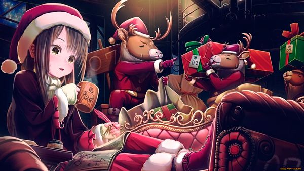 Картинка аниме 2 - Девочка пишет поздравление, а на фоне рождественские олени грузят подарки