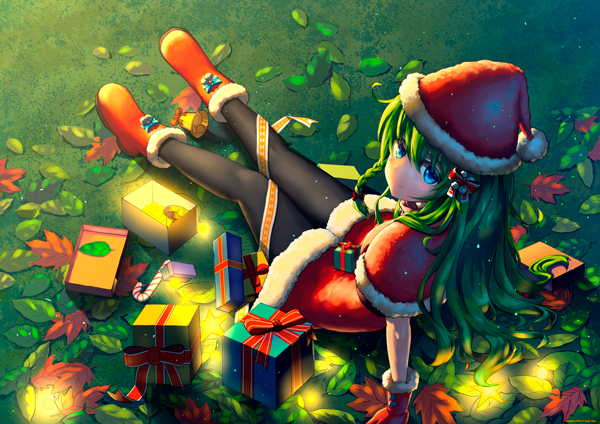 Картинка аниме 3 - Милая девушка сидит в окружении большого количества новогодних подарков